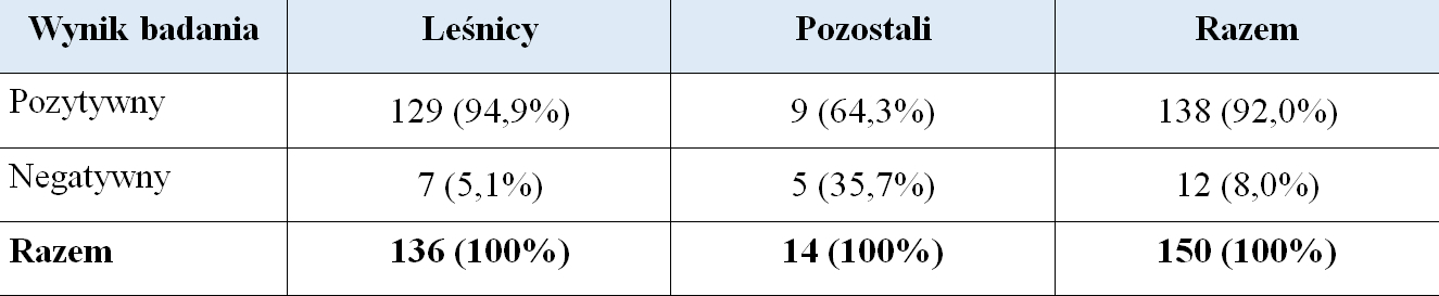 Spośród 1110 osób badanych w projekcie zaszczepienie deklarowali przede wszystkim leśnicy: 136 na 161 badanych (84,5%). Tylko 14 osób wykonujących inny zawód potwierdziło wykonanie szczepień profilaktycznych. Wśród zaszczepionych leśników stwierdzono 129 wyników dodatnich (94,9%). Leśnicy pochodzili przeważnie z województwa mazowieckiego i dolnośląskiego (Tabela 1).