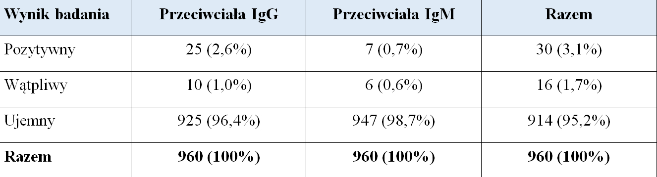 Osoby nieszczepione badano standardowo półilościowo w dwóch klasach przeciwciał (IgM i IgG). W klasie IgM wynik dodatni uzyskano w siedmiu przypadkach (0,7%): u trzech kobiet i czterech mężczyzn. Wyniki dodatnie w klasie IgG stwierdzono w 25 przypadkach (2,6%): u dwunastu kobiet i trzynastu mężczyzn. U dwóch osób stwierdzono wyniki dodatnie równocześnie w klasie IgM i IgG (co może świadczyć o aktualnym przebiegu choroby lub rekonwalescencji). U sześciu osób (4 kobiety i 2 mężczyzn) stwierdzono wynik wątpliwy w klasie IgM, a u dziesięciu osób (sześć kobiet i czterech mężczyzn) wynik wątpliwy w klasie IgG. W dalszej analizie osoby te traktowano jako seropozytywne (Tabela 2).